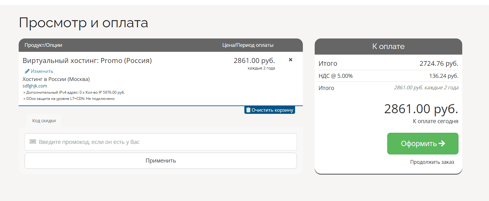 5. Дождитесь сообщения, что «код скидки применён», убедитесь, что сумма уменьшилась, и нажмите «Оформить».