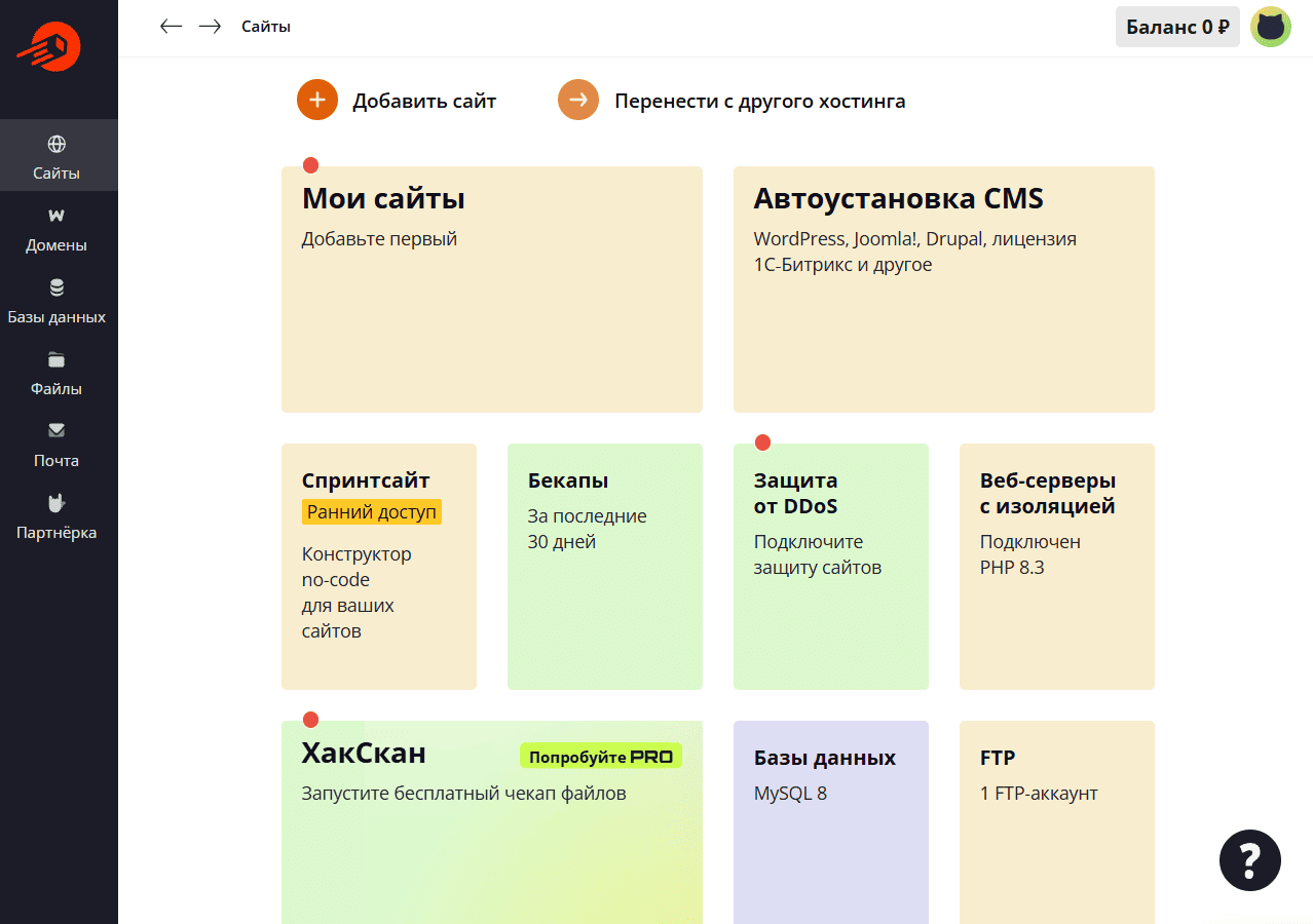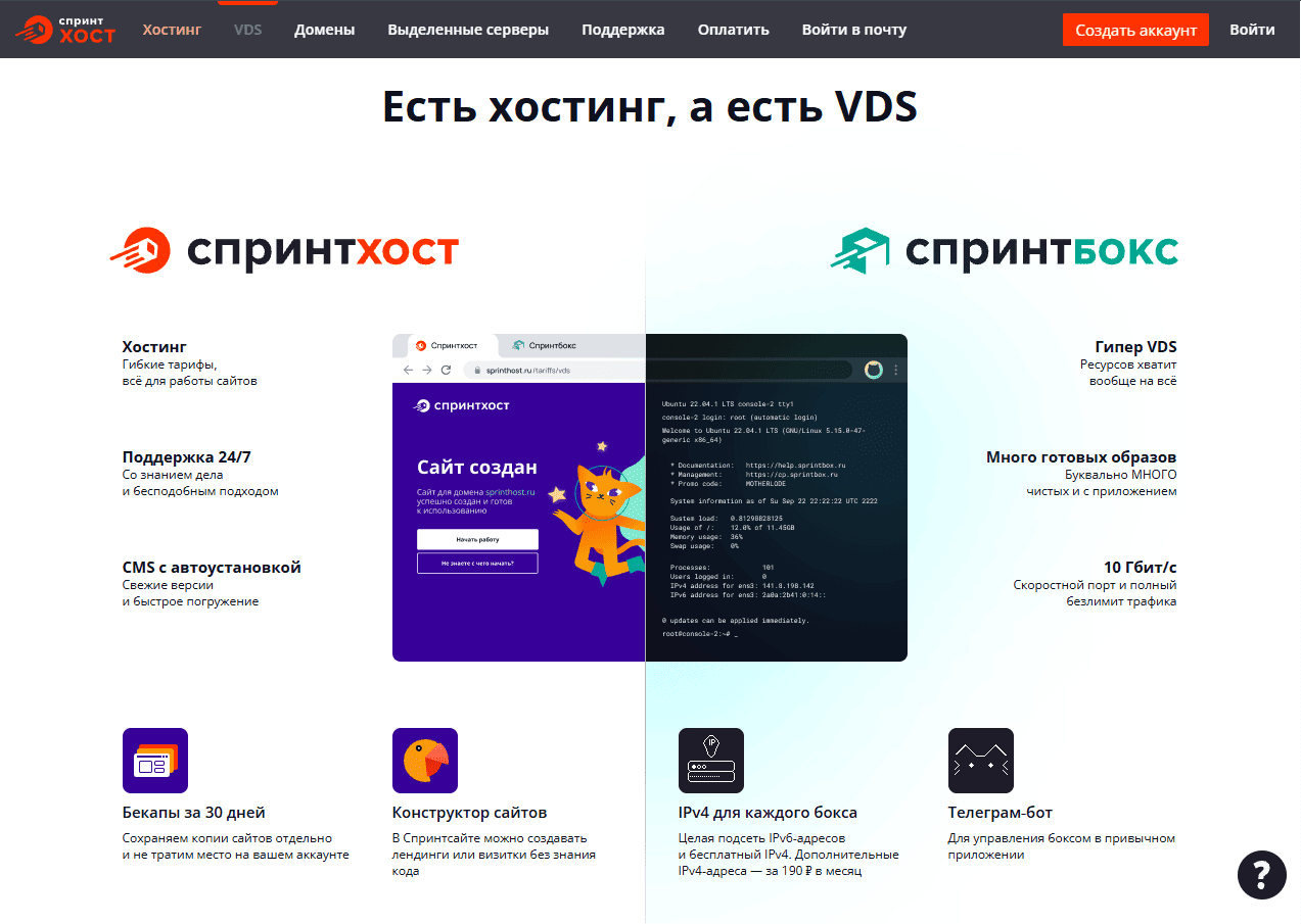 При первом знакомстве с хостингом привлекает удобный и информативный сайт с хорошей навигацией и понятным справочным разделом. Виртуальный хостинг представлен различными тарифными планами с отличием по количеству сайтов, объему NVMe-диска и цене. Тарифы не предусматривают докупку ресурсов, но позволяют легко менять планы через панель управления. Максимальный тариф включает до 80 ГБ диска и неограниченное число сайтов и услуг. Кроме виртуального хостинга, компания предлагает VDS (Спринтбокс) и выделенные серверы.
