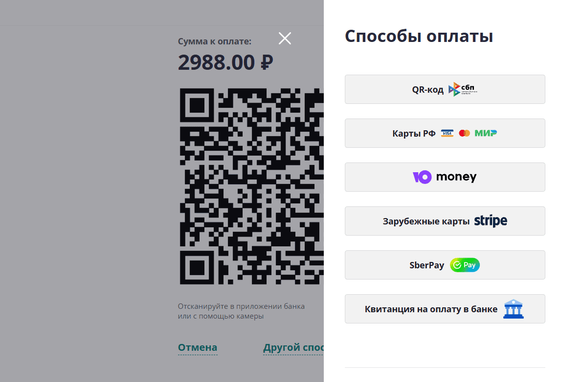 После выбора суммы пополнения клиент может воспользоваться любым из предложенных способов оплаты.